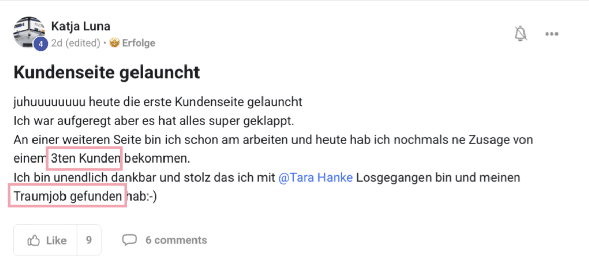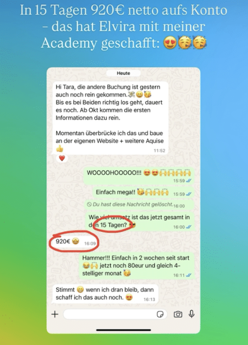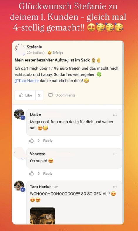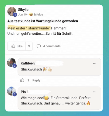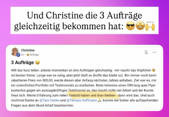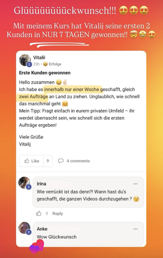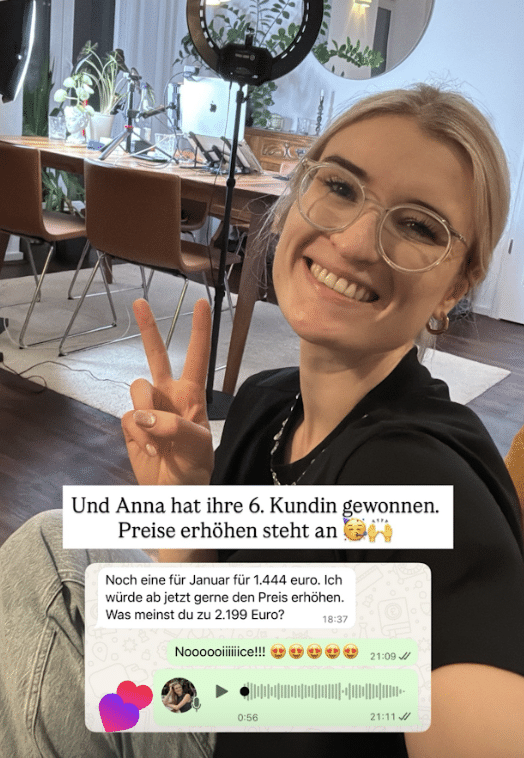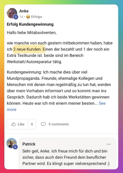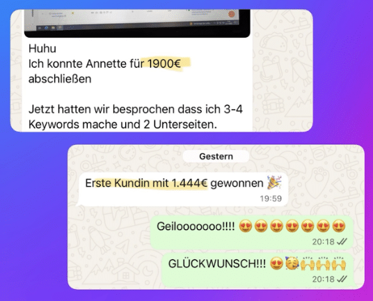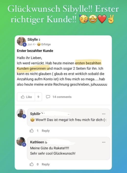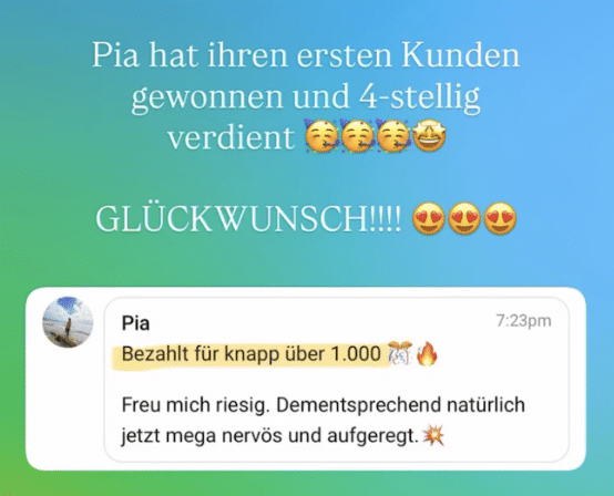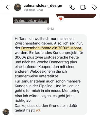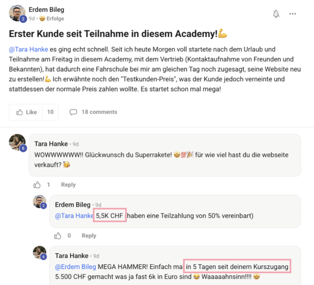 - Ergebnis: Nach nur 5 Tagen im Coaching hat er bereits seinen ersten vollzahlenden Kunden für 5.500 CHF (umgerechnet ca. 6.000 €) gewonnen. Was für ein Erfolg!