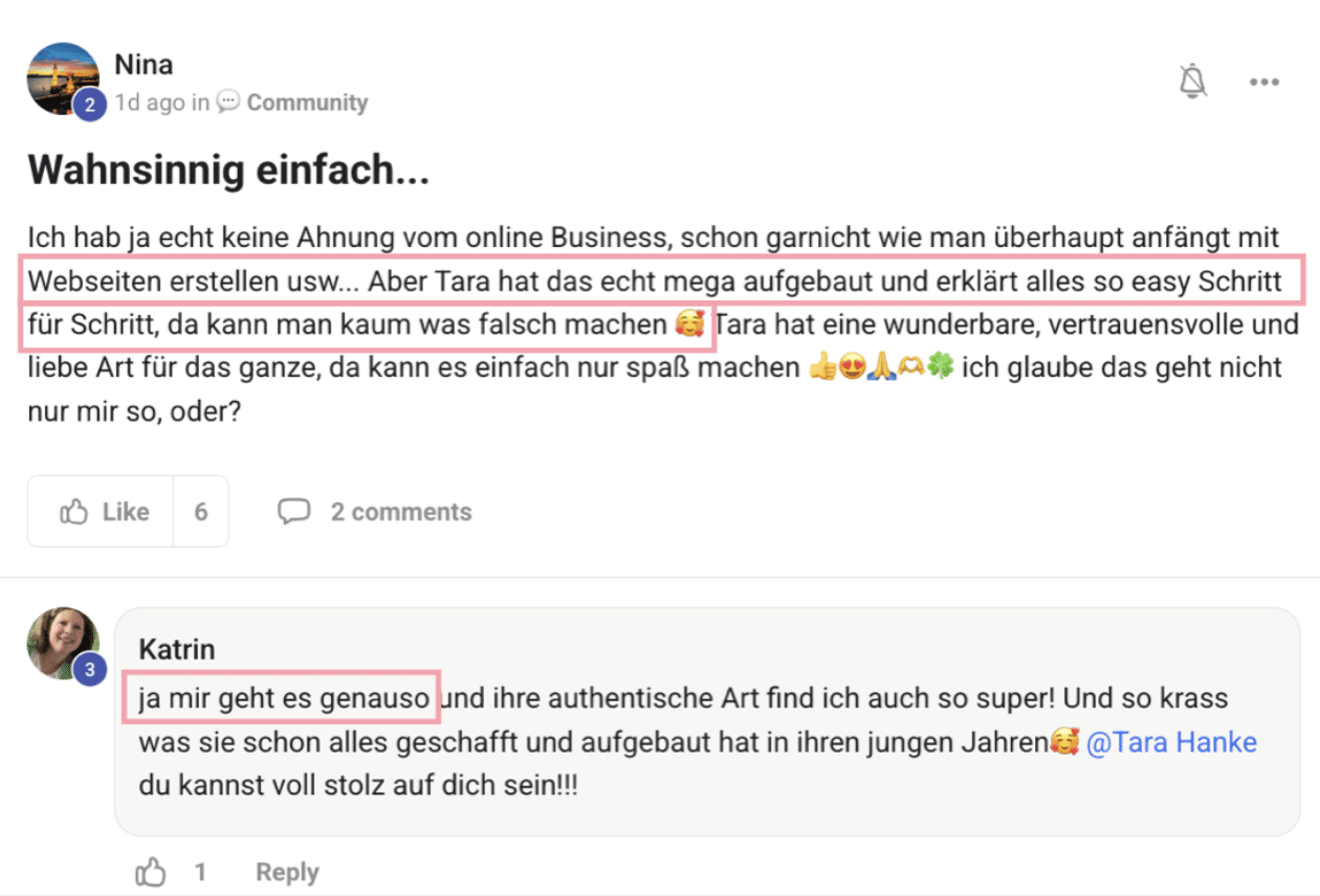 Gepostet auf Katharina RothengassTrustindex überprüft, ob die Originalquelle der Bewertung Google ist. Tara ist eine sehr sympathische & positive Persönlichkeit. Sie strahlt Ruhe aus und macht es überaus angenehmen, mit ihr als Coach zusammenzuarbeiten– man fühlt sich bei ihr einfach direkt gut aufgehoben und in den richtigen Händen. Sehr kompetent! Ich kann Tara wirklich von Herzen weiterempfehlen!Gepostet auf Simone KesslerTrustindex überprüft, ob die Originalquelle der Bewertung Google ist. Tolle Frau, die jeden motivieren kann. Die Erklärvideos sind sehr verständlich und Tara hat immer ein offenes Ohr und die Lösung für alle Probleme.Gepostet auf Asked for a Lemon?Trustindex überprüft, ob die Originalquelle der Bewertung Google ist. Ich bin mittlerweile an meiner 2. erfolgreichen Website. Die Lektionen sind weltklasse und idiotensicher erklärt, bis auf den kleinsten Mausklick. Tara ist sehr sympathisch und in den Live Calls geduldig und hilfsbereit, aufmerksam und lösungsorientiert. DANKE für dieses Wissen.. ich liebe diese Arbeit und bin schon süchtig nach mehr Artikel schreiben, Blog bearbeiten und Website gestalten. 100% empfehlenswert <3Gepostet auf Stephanie “Phabs” BrölingenTrustindex überprüft, ob die Originalquelle der Bewertung Google ist. Ich kann den Kurs "Digital Freedom Biz" von Tara Hanke zu 100 % weiterempfehlen. Die Inhalte sind gut aufbereitet, leicht verständlich und direkt umsetzbar. Bei Fragen bekomme ich super schnell eine Video-Antwort von Tara, nach der meine Frage komplett beantwortet ist. Also der Kurs hält, was er verspricht und Tara ist eine super freundliche, geduldige und vor allem kompetente Kursleiterin.Gepostet auf Katharina MartinTrustindex überprüft, ob die Originalquelle der Bewertung Google ist. Taras Kurs ist eine meiner besten Entscheidungen gewesen! Mit ihrer Hilfe habe ich mein Reisemagazin reiseglueck-online aufgebaut. Ich bin ihr nicht nur für das Wissen, dass sie in jedem einzelnen Schritt erklärt, dankbar, sondern auch für die Community, die sie geschaffen hat und in der man Unterstützung findet und für ihren unermüdlichen persönlichen Support! Danke!!Gepostet auf KaMa BudingTrustindex überprüft, ob die Originalquelle der Bewertung Google ist. Ich bin froh den Kurs gekauft zu haben Tara hält was sie verspricht der Kurs ist super aufgebaut und ich bin schon so viel weiter Stück für Stück an mein ZielGepostet auf Sara TheiTrustindex überprüft, ob die Originalquelle der Bewertung Google ist. Ich bin absolut begeistert von der Zusammenarbeit mit Tara Hanke! Sie bringt nicht nur fundiertes SEO-Know-how mit, sondern hat auch ein feines Gespür dafür, wie man Websites strategisch optimiert – und das immer individuell auf das jeweilige Unternehmen zugeschnitten. Die Beratung war super transparent, verständlich und vor allem praxisnah. Dank ihrer Unterstützung konnten wir unsere Sichtbarkeit bei Google deutlich steigern. Besonders schätze ich ihre klare Kommunikation, die ehrliche Einschätzung und ihre schnelle Reaktionszeit. Wer seriöse und nachhaltige SEO-Beratung sucht, ist bei Tara Hanke definitiv an der richtigen Adresse!Gepostet auf Holger SeinTrustindex überprüft, ob die Originalquelle der Bewertung Google ist. Danke vielmals! für diesen Kurs, voller Wunder und deinen magischen, einzigartigen, kompetenten und sehr hilfreichen Support in allem rund ums Thema Bloggen, Wordpress, Homepage. Bin mega begeistert vom Kurs und deiner Unterstützung :) Schön das es dich gibt, deinem Sein und was du in die Welt bringst! Danke! Alles Liebe und Danke HolgerGepostet auf Stefanie FreylerTrustindex überprüft, ob die Originalquelle der Bewertung Google ist. Tara ist ein äußerst symphatischer und authentischer Mensch und genau mit dieser Art hat sie mich überzeugt Digital Freedom Biz auszuprobieren und ich muss sagen, es ist einfach zu handhaben, es wird alles Schritt für Schritt erklärt, sodass es jeder versteht, alles wird gut erklärt. Ich bin froh, diesen Schritt gegangen zu sein. Lg Steffi