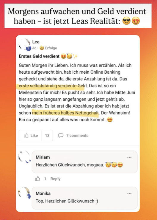 - Ausgangssituation: Lea war Altenpflegerin und wollte mehr verdienen, um ihrer Familie und sich selbst ein besseres Leben zu ermöglichen. Es war leider klar, dass das Gehalt als Altenpflegerin das niemals hergeben würde...